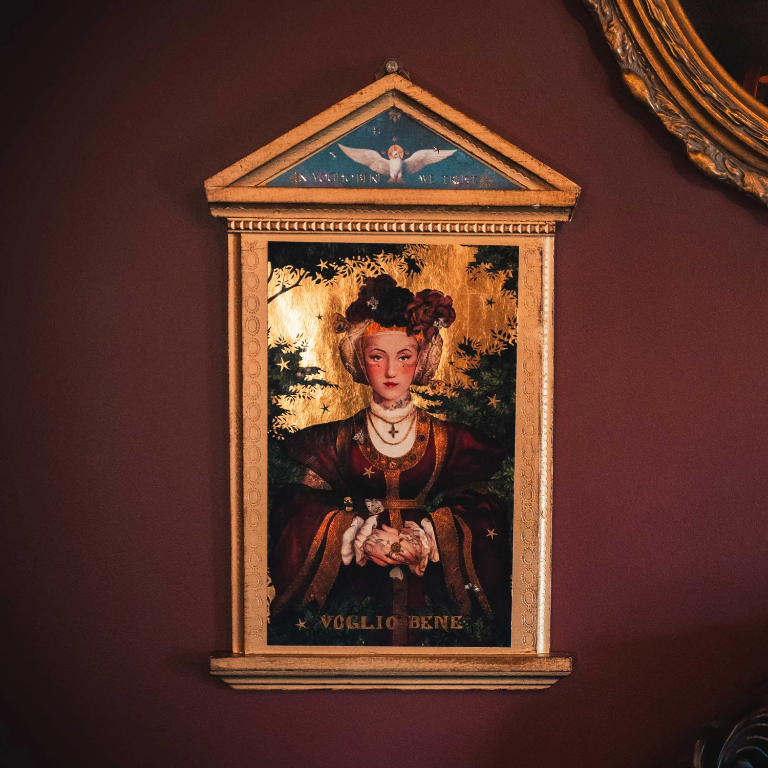 Illustrated sacred wooden tablet with beautiful gilding and collage imagery printed on premium paper. The image depicts Ann of Cleeves adorned with gold embellishments and hand stamped detailing.