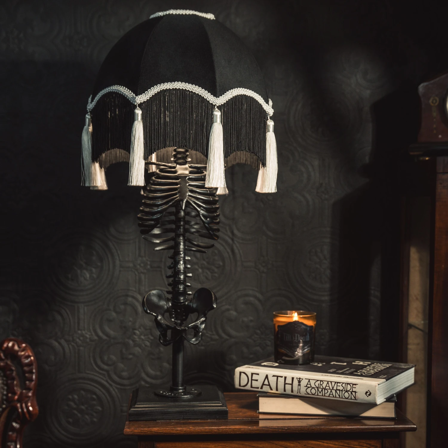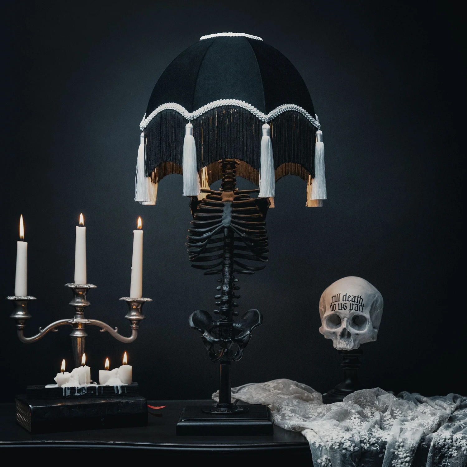 This includes the ‘Cruella Edition’ lampshade. The Cruella Lampshade combines a classical style lampshade with a gothic aesthetic, adding a dark sophisticated touch to The Skeleton Lamp. Cruella has ice white tassels and braiding to contrast against the black velvet fabric and white interior lining.