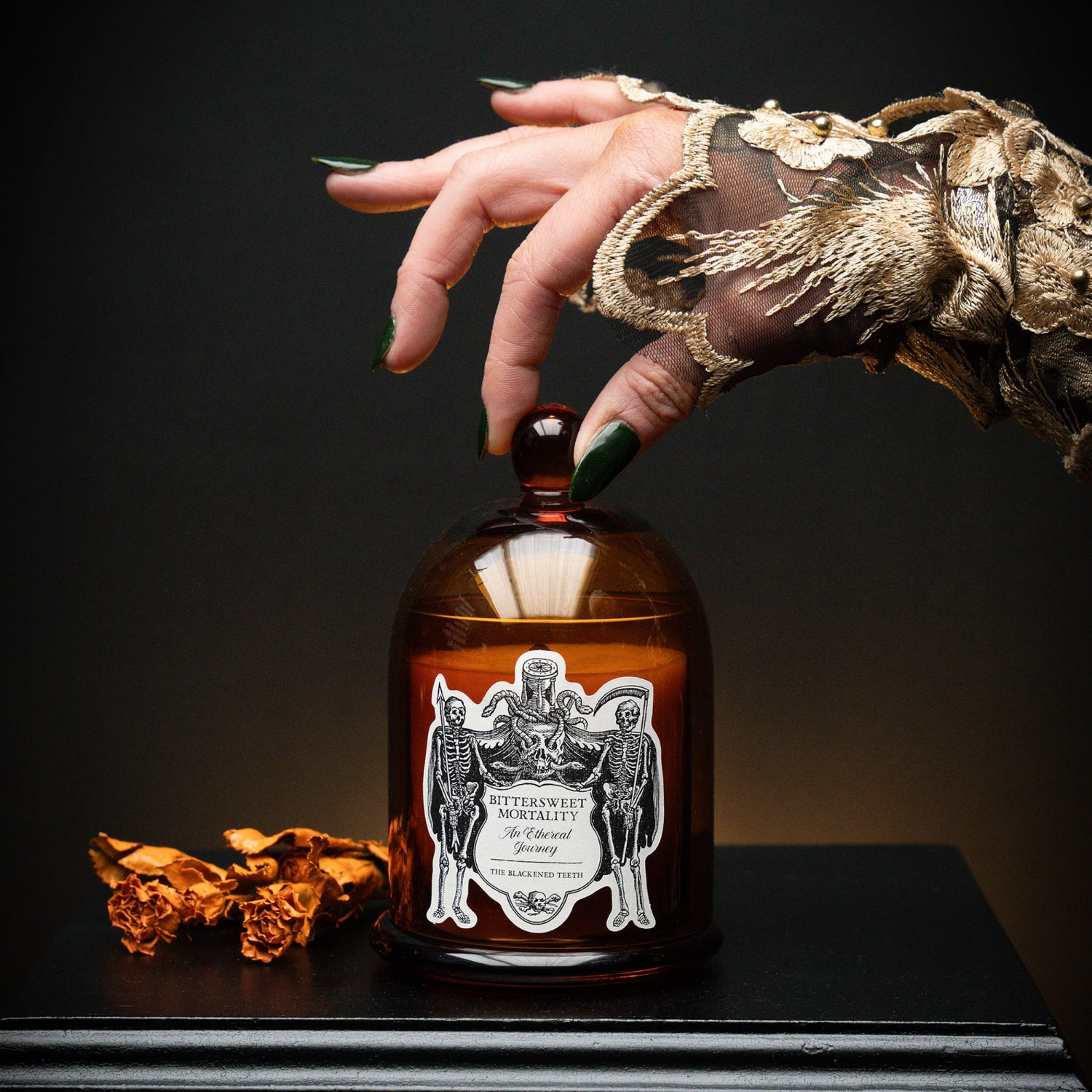 The uniquely designed amber cloche jar candle is a part of the Danse Macabre collection this Halloween. All of our cloche jar candles are hand-poured in our UK Workshop by our in-house Chandlers using a natural coconut wax blend (vegan friendly) and premium quality fragrance oils (vegan friendly).