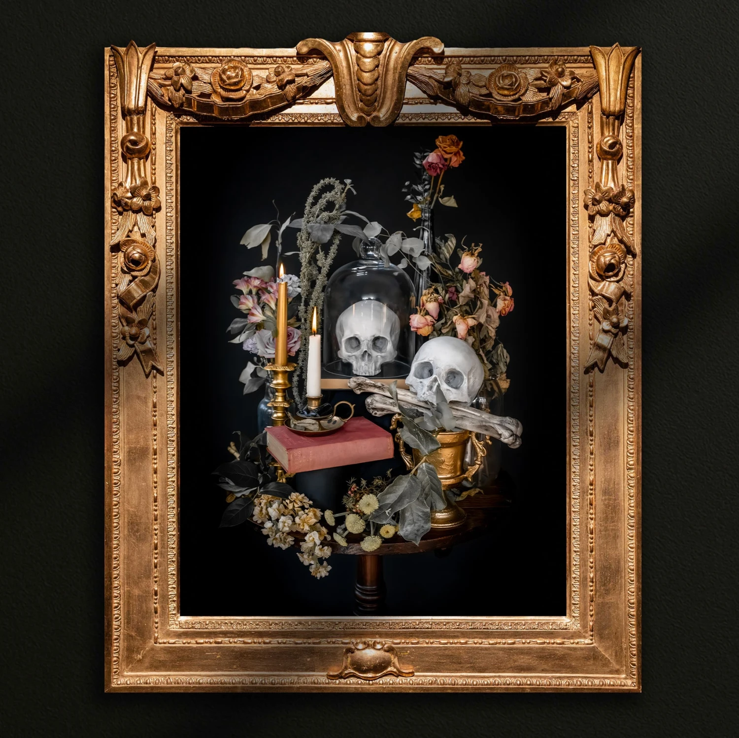 Surrounded by flickering candlesticks and timeworn books, the scene echoes the quiet symbolism of impermanence. The flowers, in various states of life and wither, speak to the fleeting nature of existence – urging us to bloom fully while we can. The skulls remind us that death is not a distant abstraction, but an eventual certainty for all.