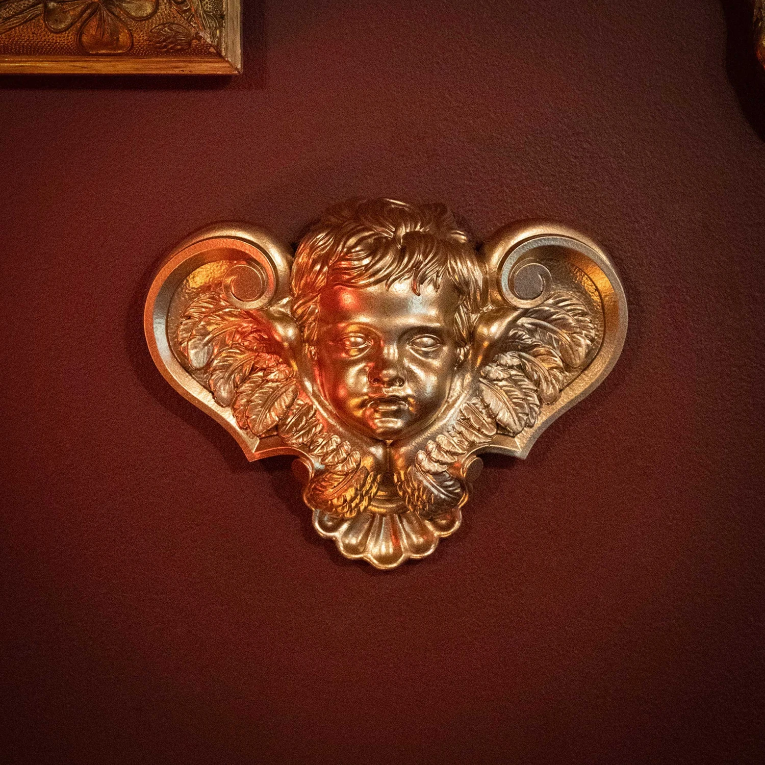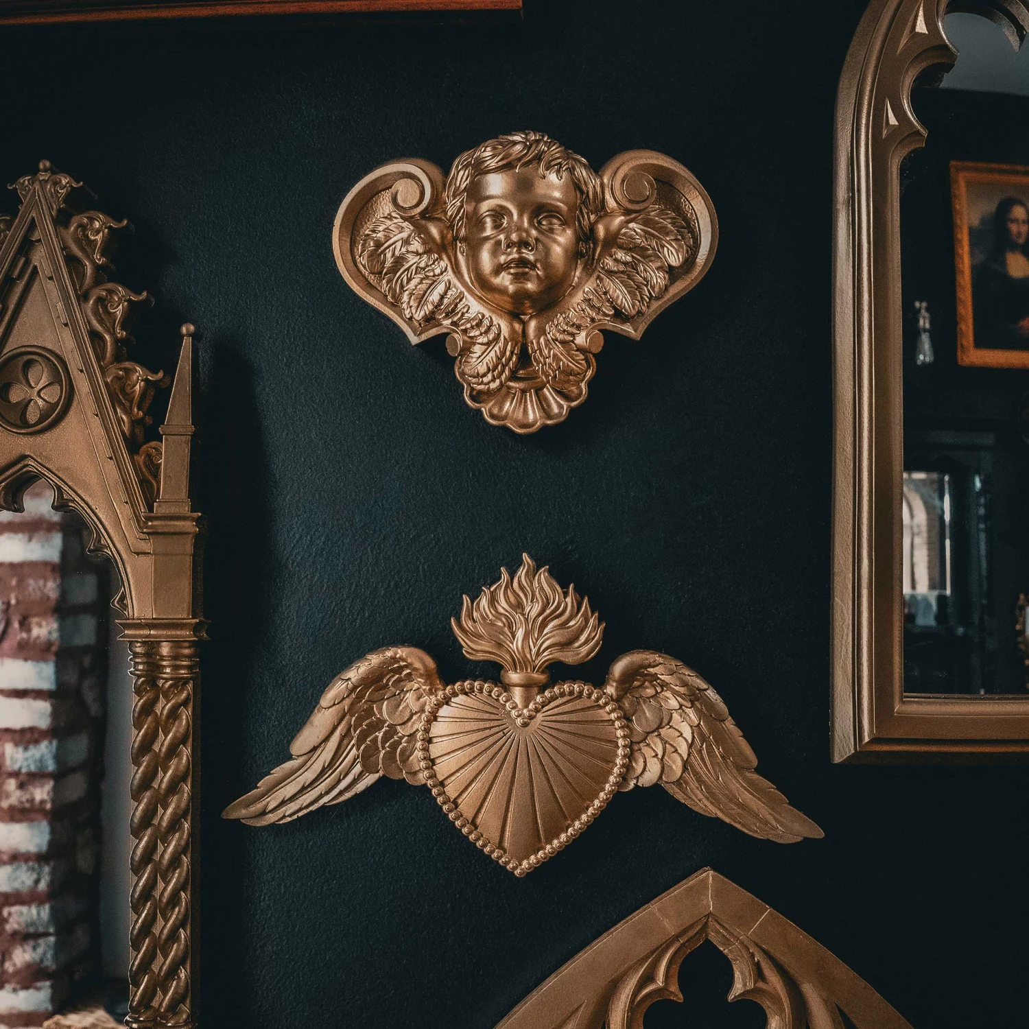 Elevate your gothic gallery wall with the addition of an iconic cherub sculpture in a luxurious gold effect. Embody renaissance elegance with this baroque-inspired piece.