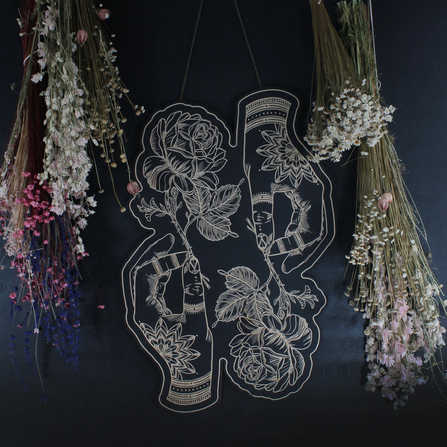 Finished with brass chain to hang on to the wall.