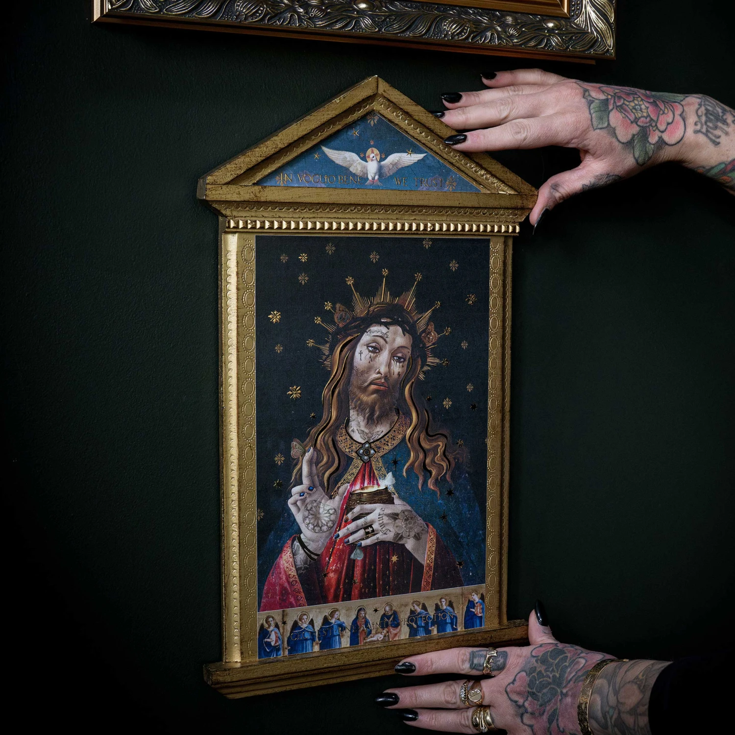 Illustrated sacred wooden tablet with beautiful gilding and collage imagery printed on premium paper. The image depicts The Divine Child adorned with gold embellishments and hand stamped detailing.