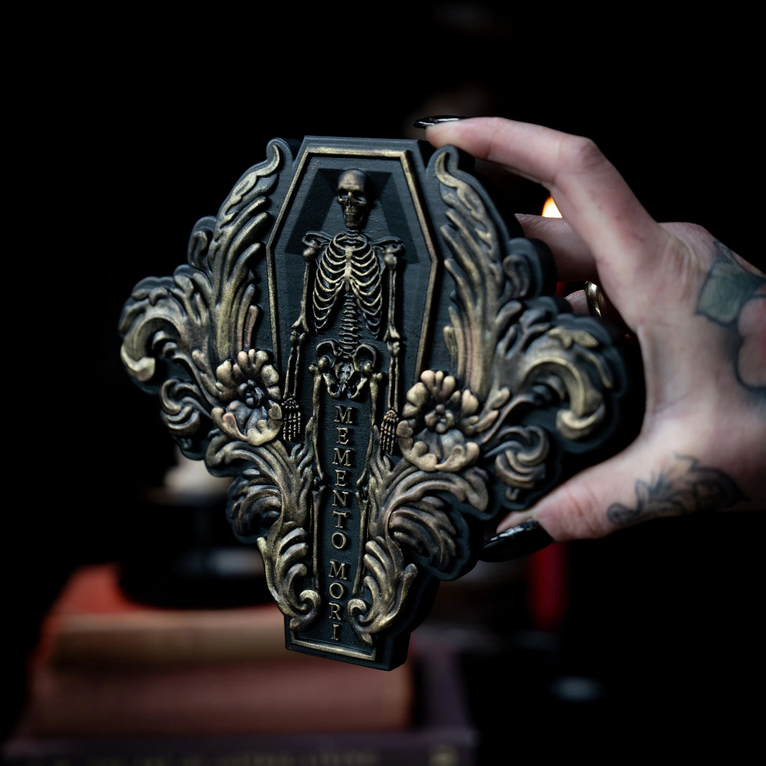 The phrase “Memento Mori” is Latin for “remember you must die”. It serves as a powerful reminder of life’s fleeting nature. Finished in matte black with a hand-applied gold gild.