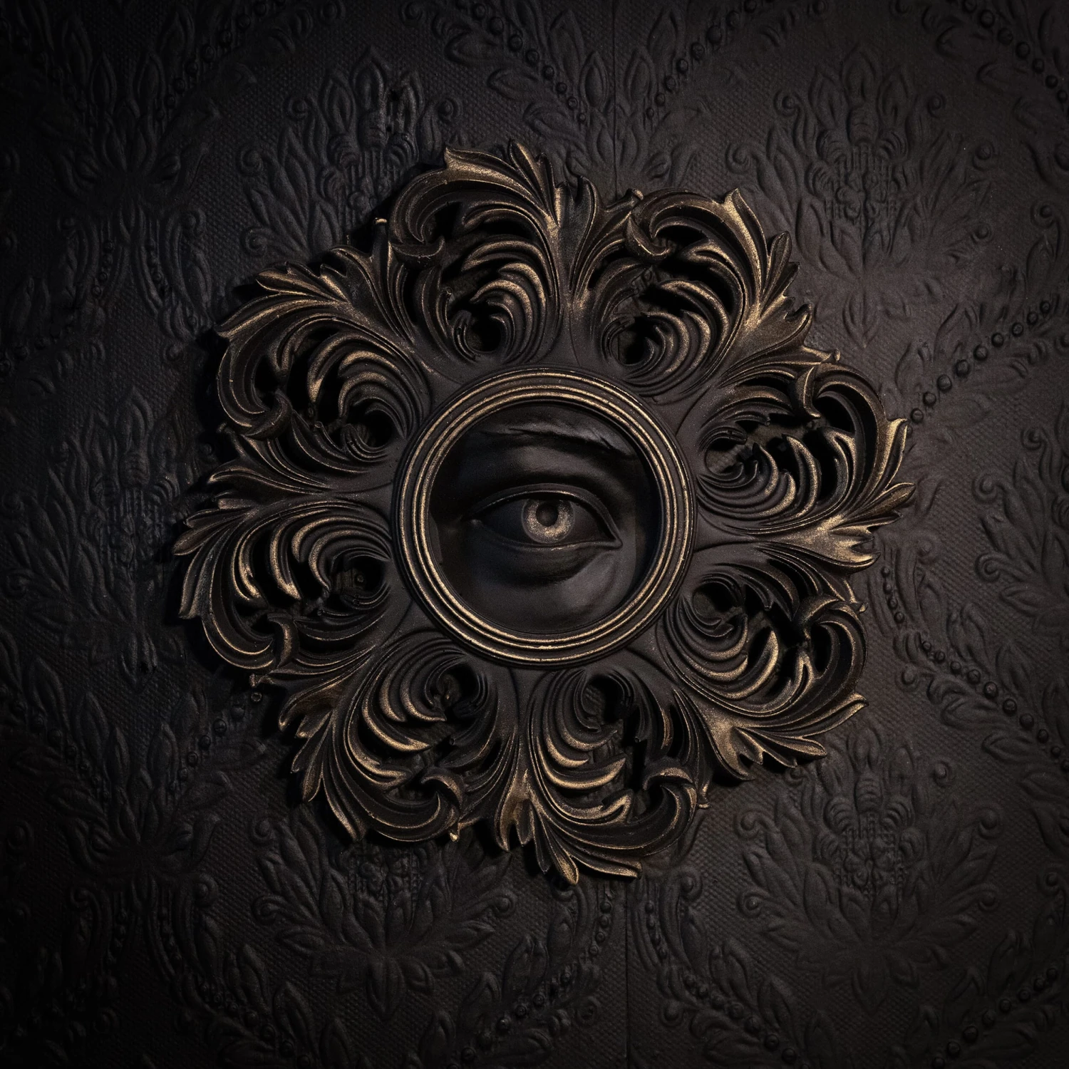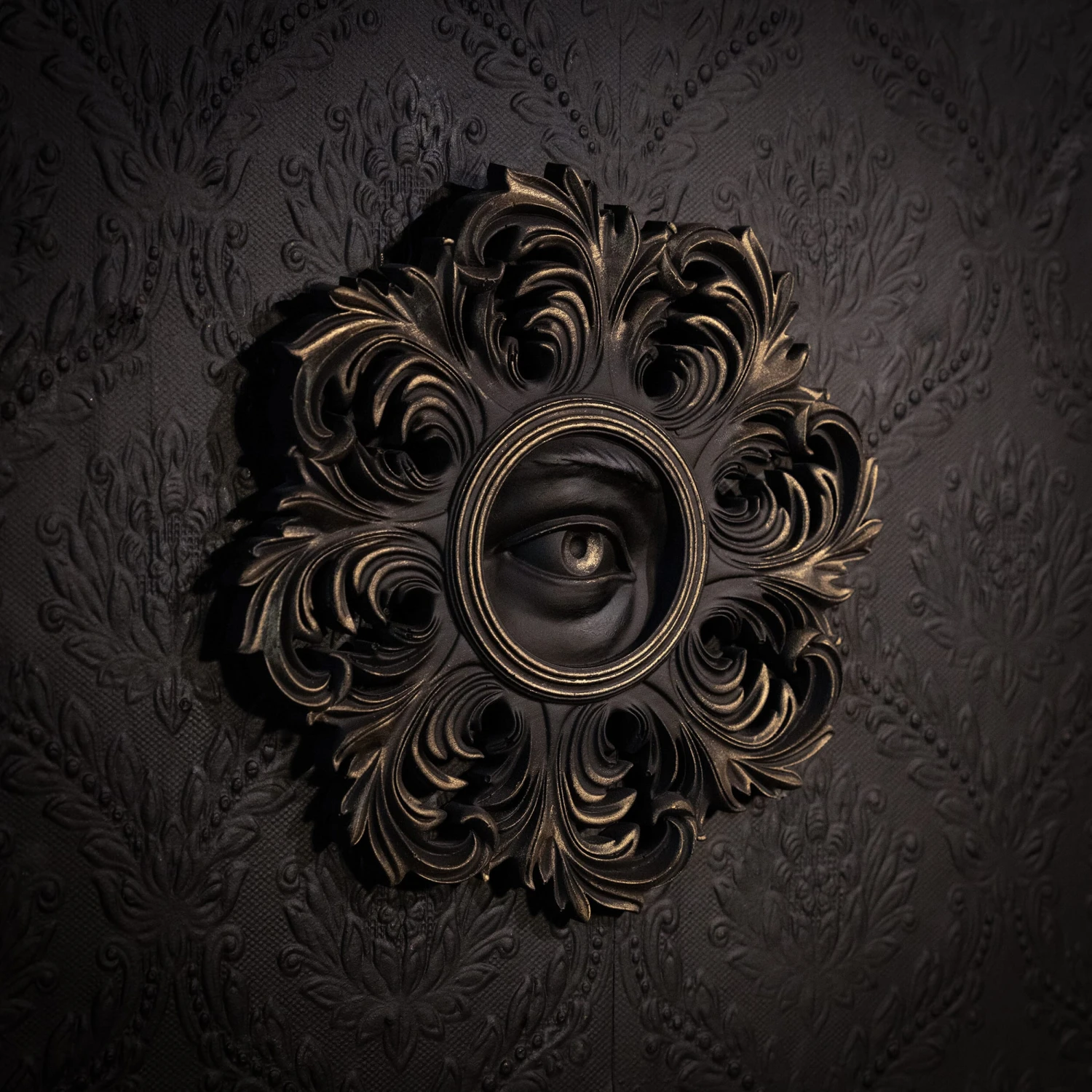 A beautiful baroque-style plaque with a detailed and alluring eye design at the centre. Handcrafted in black resin with a dusting of hold to bring life to the intricate details. A perfect addition to any gothic gallery wall.