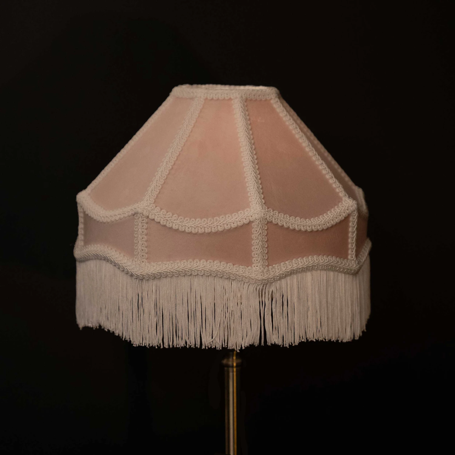 Fabric: A baby pale pink velvet style fabric with contrasting white fringing and braiding adornments.