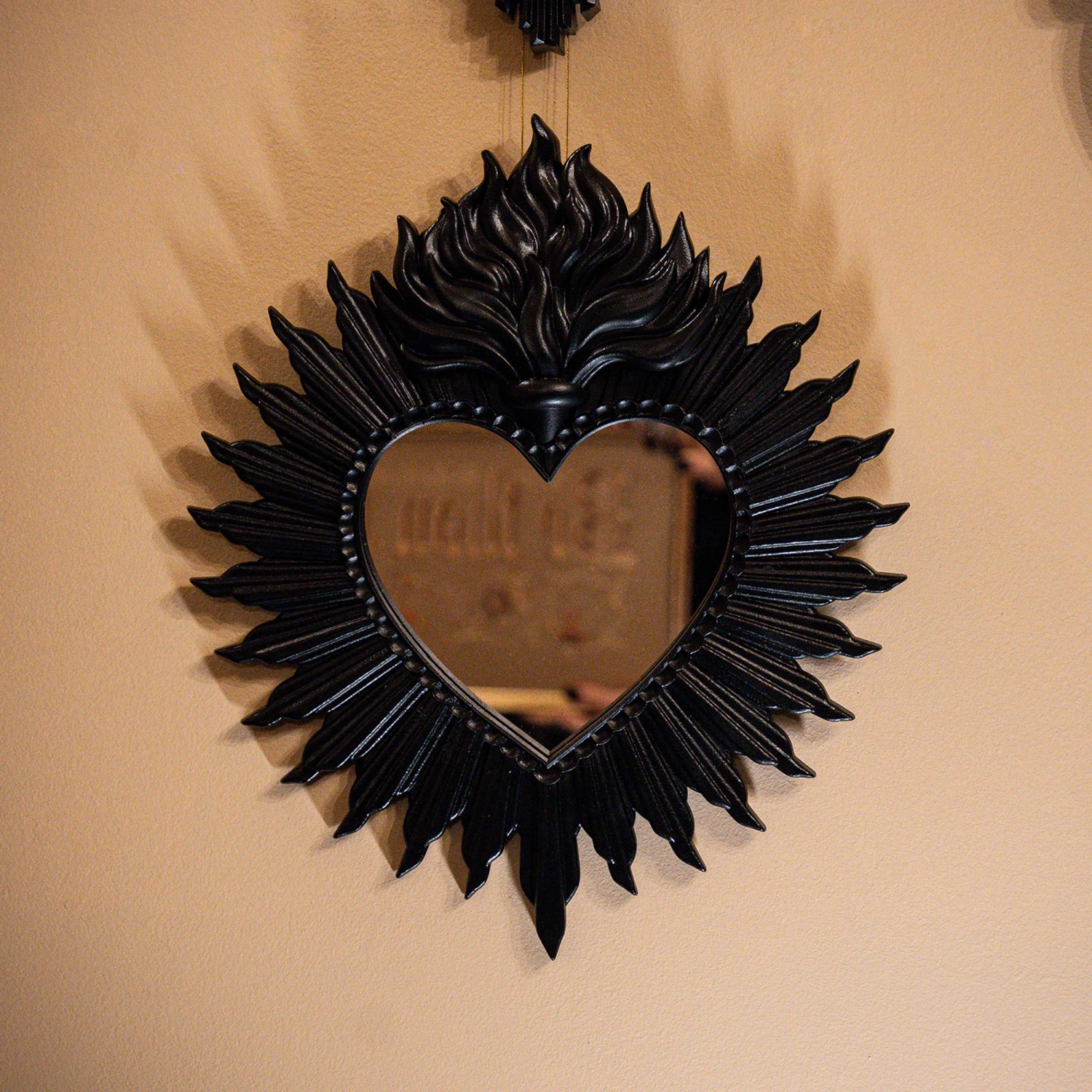 The Renata Sacred Heart Mirror with a golden sunburst and flame adornment. Renata Sacred Heart Mirror has just joined the Devotion collection.