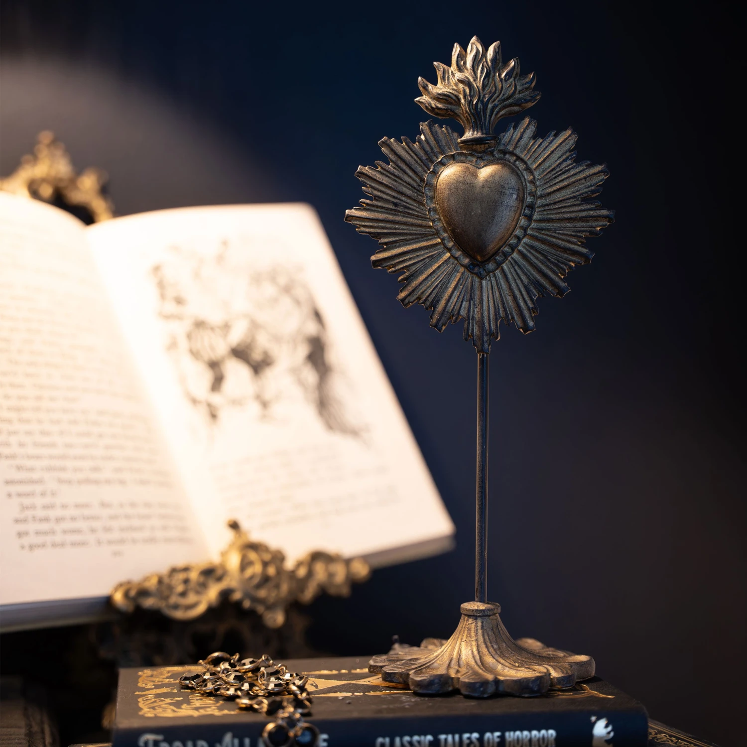 Mounted on a matching stand, this piece brings depth and elevation to any display, perfect for altars, mantelpieces, or gothic-inspired interiors. The distressed finish evokes a sense of old-world reverence, as though plucked from a crumbling European chapel or a centuries-old reliquary.