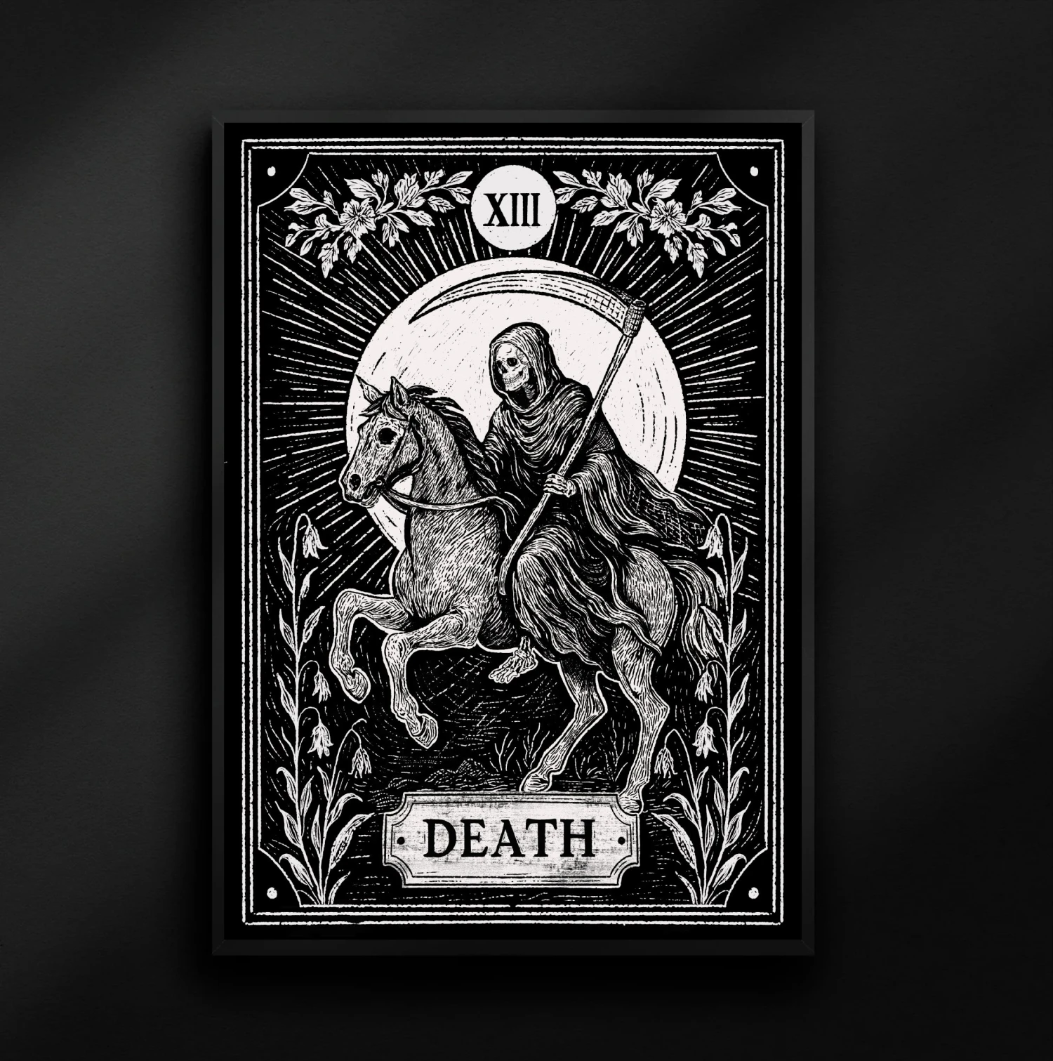 ‘Death’ Tarot Art Print. This sophisticated illustration captures the essence of rebirth and inevitable change, not as an ending, but as a powerful transition