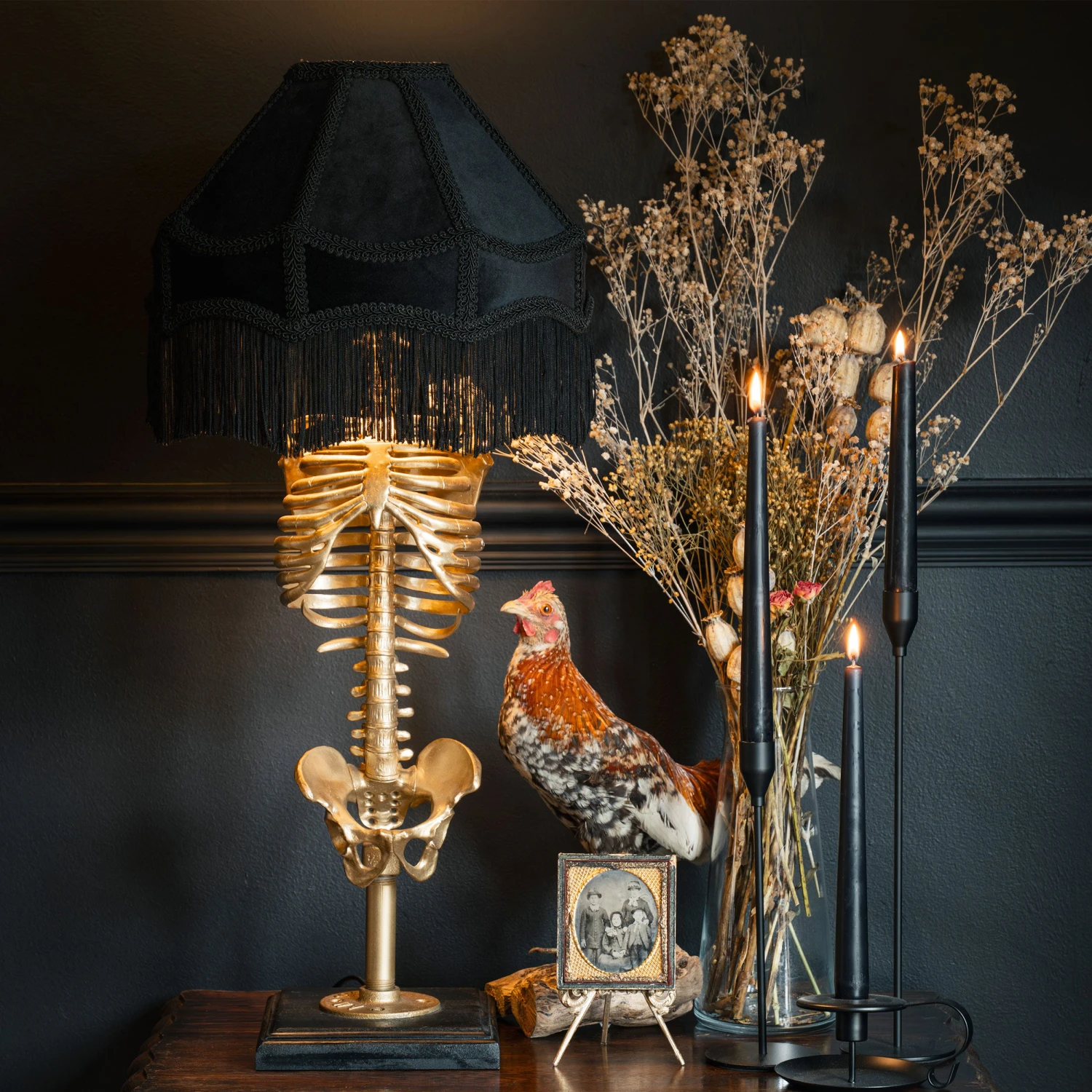 The Blackened Teeth Gold Skeleton Lamp with Nyx Lampshade is the perfect gothic lamp to adorn the gothic home.