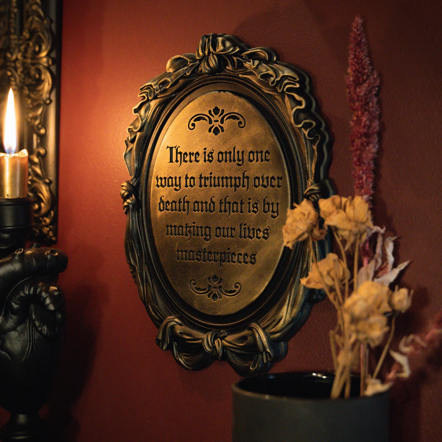 Elevate your space with the striking “Triumph Over Death” wall hanging plaque. A bold reminder to truly live. Crafted from solid black resin, this Victorian-inspired style piece features an ornate oval border with intricate robe-like fabric patterns, evoking timeless elegance. Gold hand-painted embellishments highlight its rich details, creating a dramatic contrast that draws the eye.