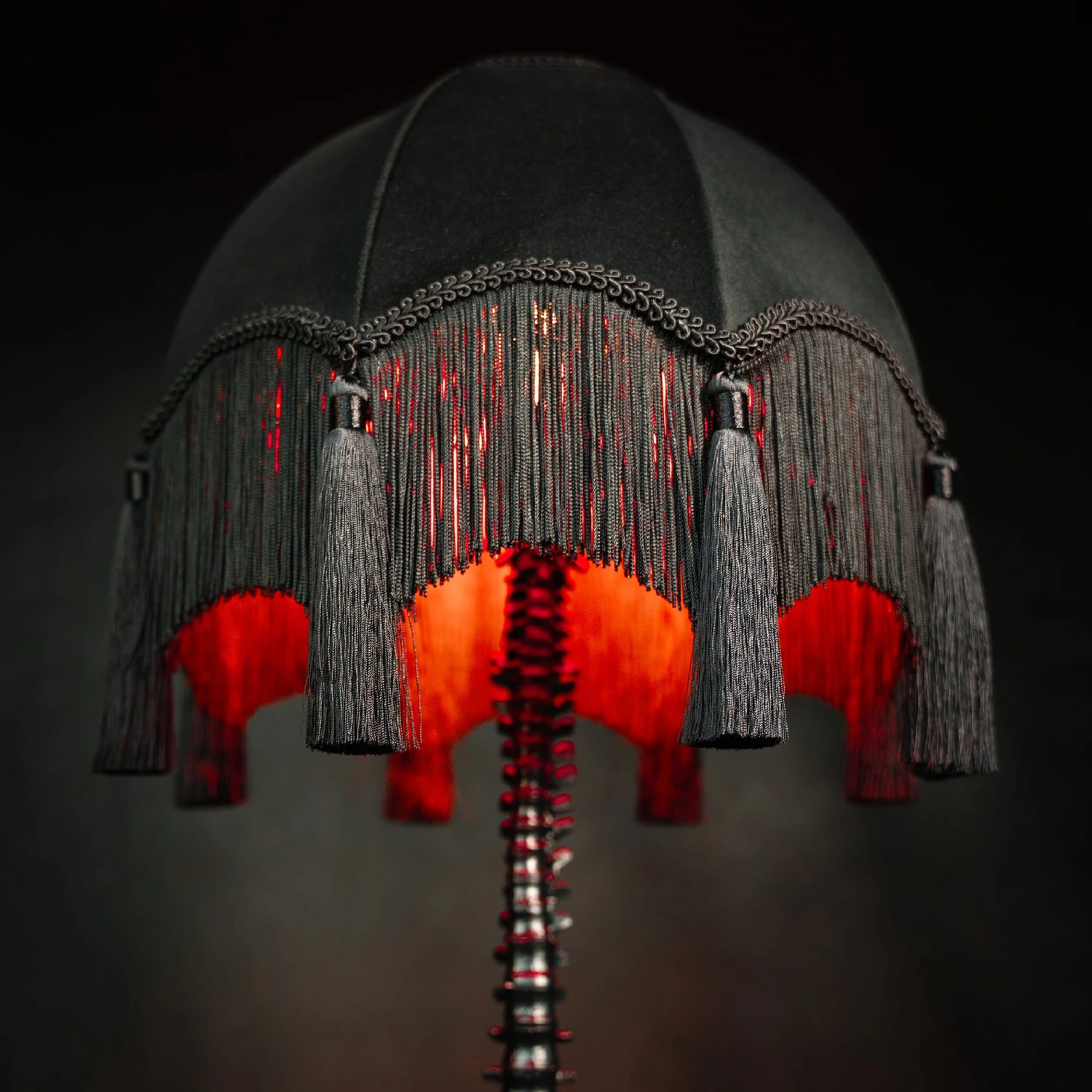 Large Black tassels giving an exquisite finish to this black beauty. Vivid blood red fabric lined interior to give an exquisite warm glow. To heighten the red glow, use with a red bulb!