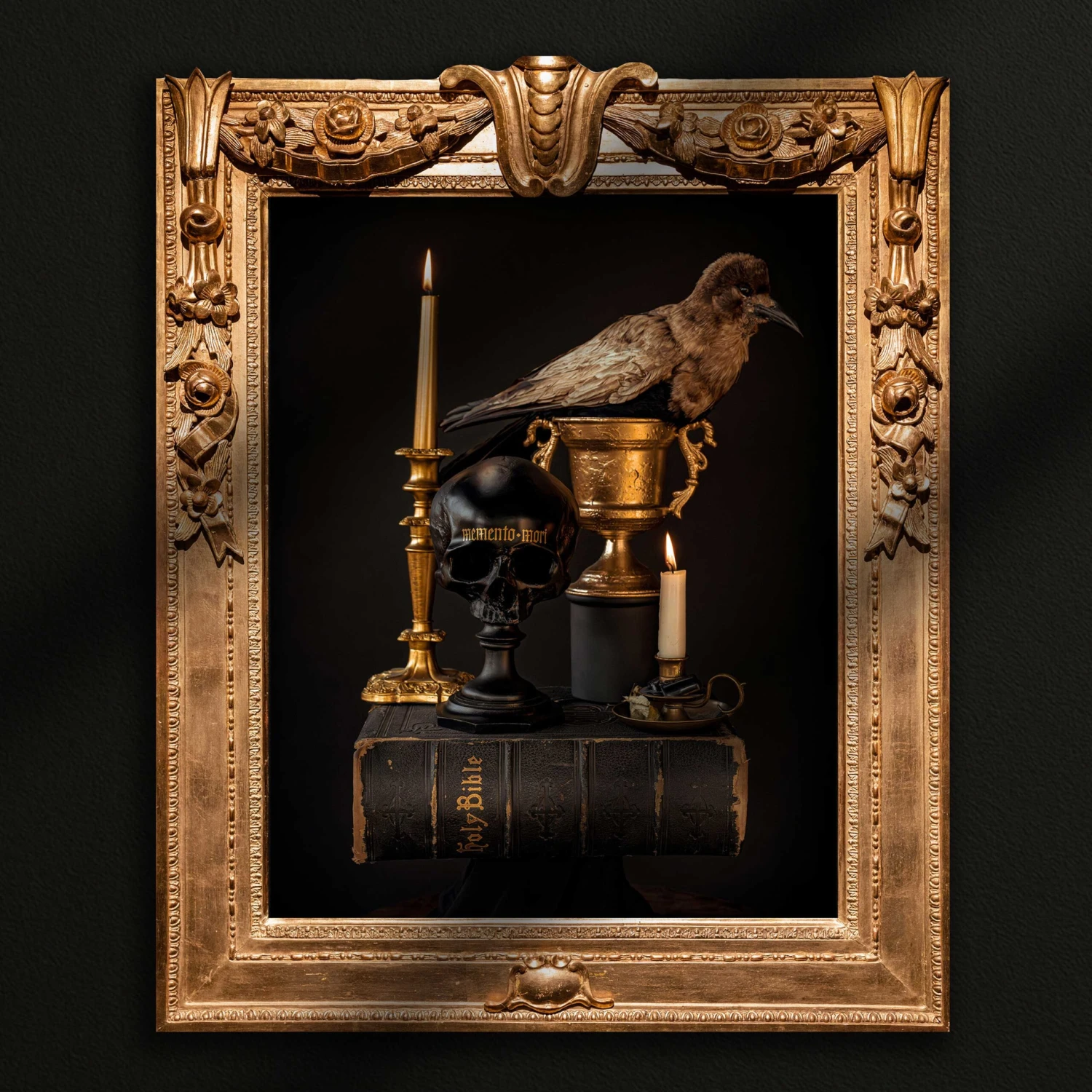 Vanitas Nocturne is a striking photographic print that embodies the solemn elegance of classical vanitas art, reimagined through a modern gothic lens. At the heart of the composition lies a human skull, inscribed in delicate gold with the timeless reminder: memento mori (“remember you must die”).
