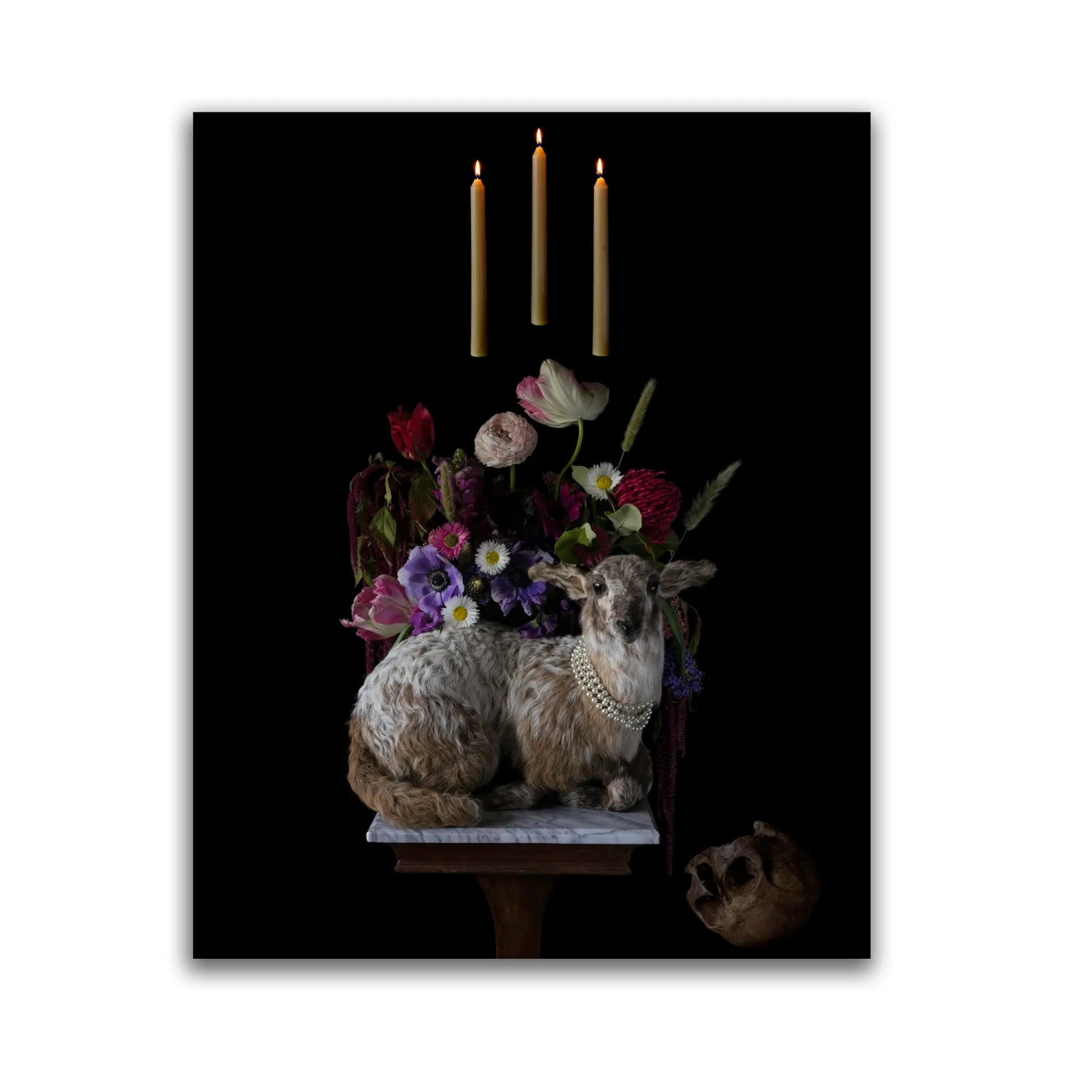 Vernum Tempus is part of an ongoing collection of photographs called ‘Onwaecnan’ which encompasses works of neo-victoriana still life images. Onwaecnan was inspired by the artist’s preoccupation with our impermanence and the death rituals of cultures across time and the globe. Pulling from vanitas imagery of seventeenth century Dutch Masters, the work combines contemporary mediums with Renaissance styling to speak to modern viewers of mortality, connection and to encourage inner contemplation.